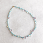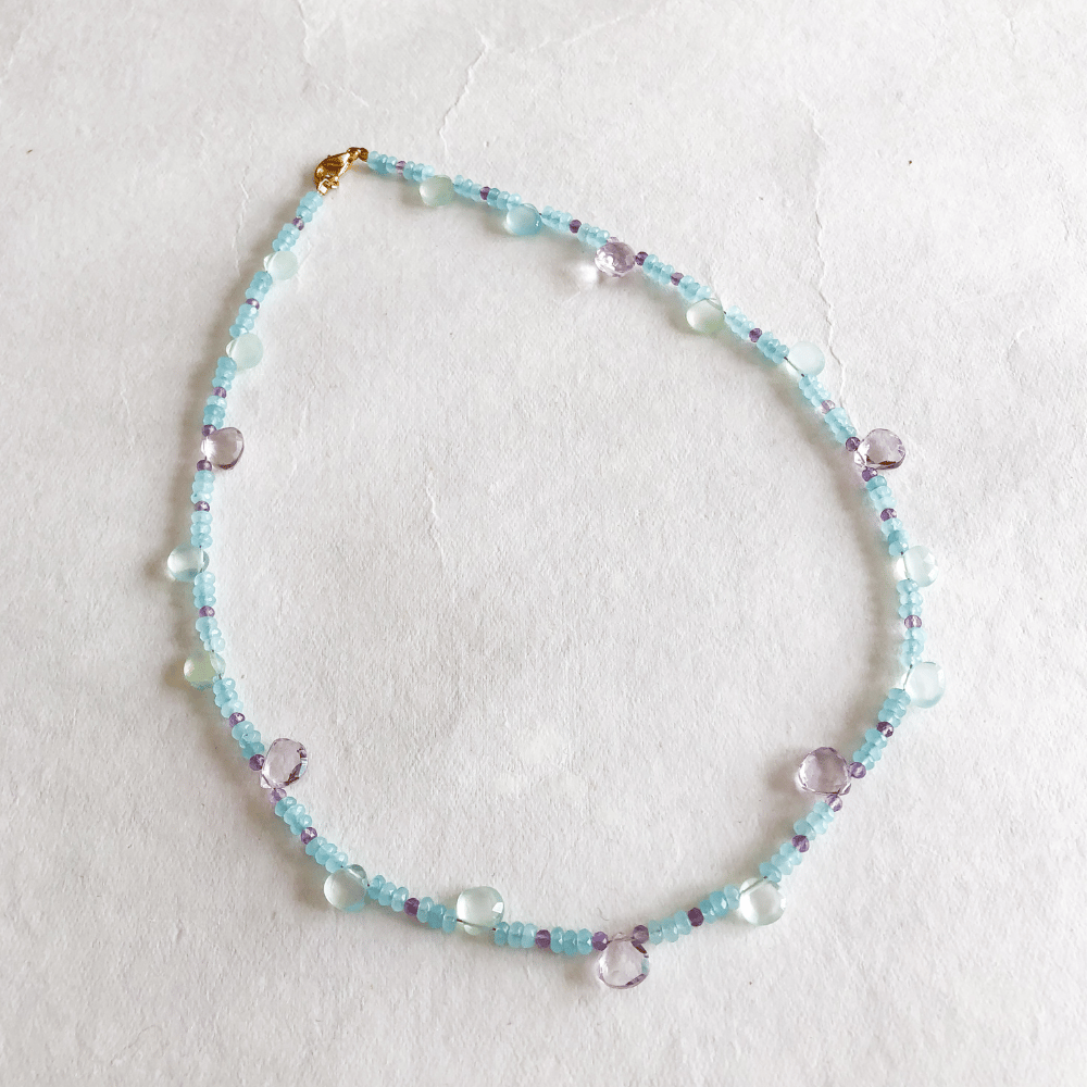 Gargantilla creada en jade azulado combinado con amatistas en diferentes tamaños y tallas combinadas con calcedonia en verde agua.