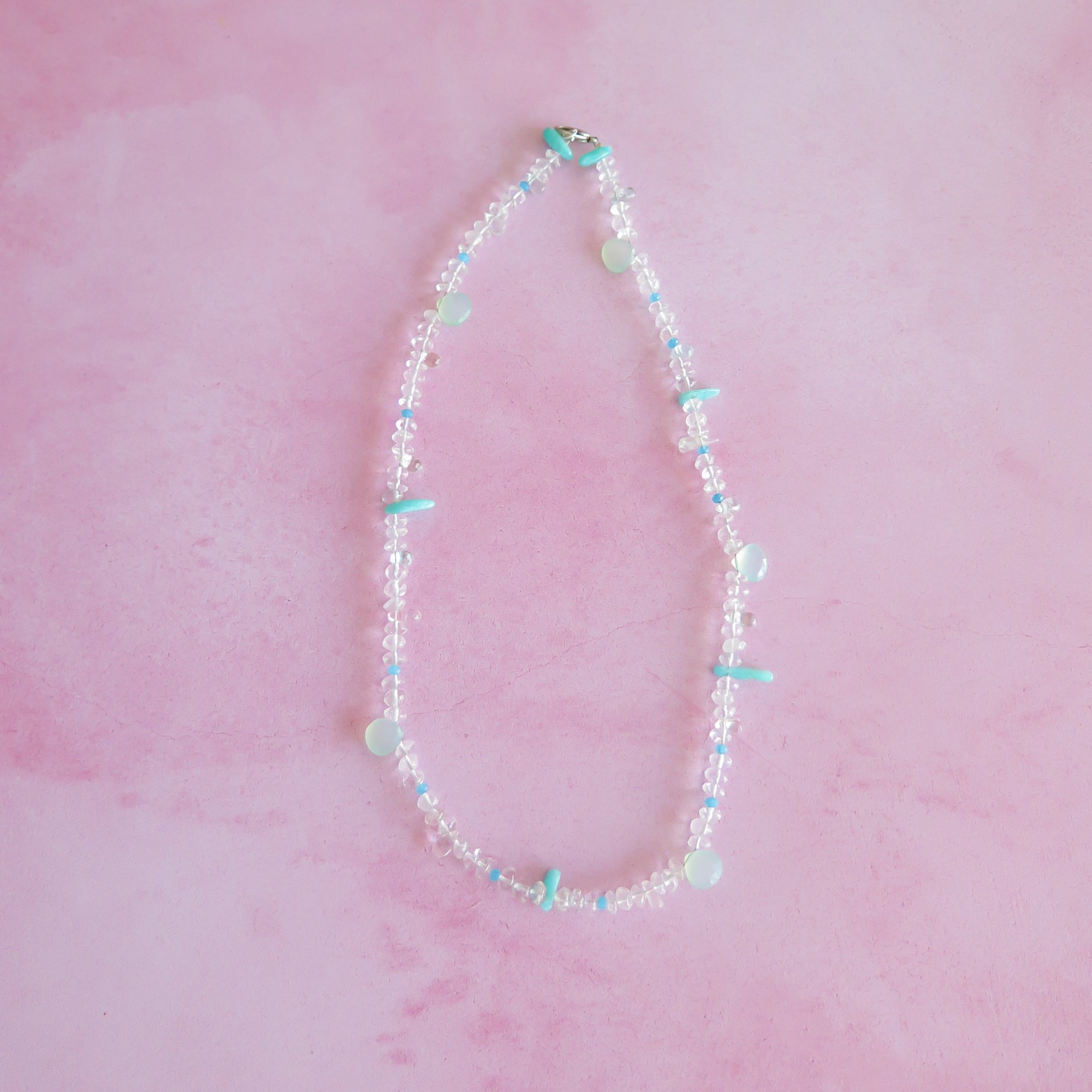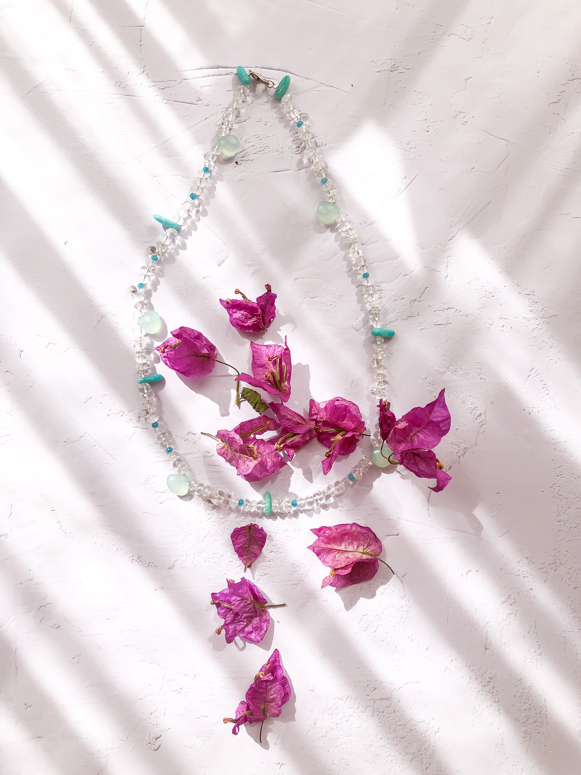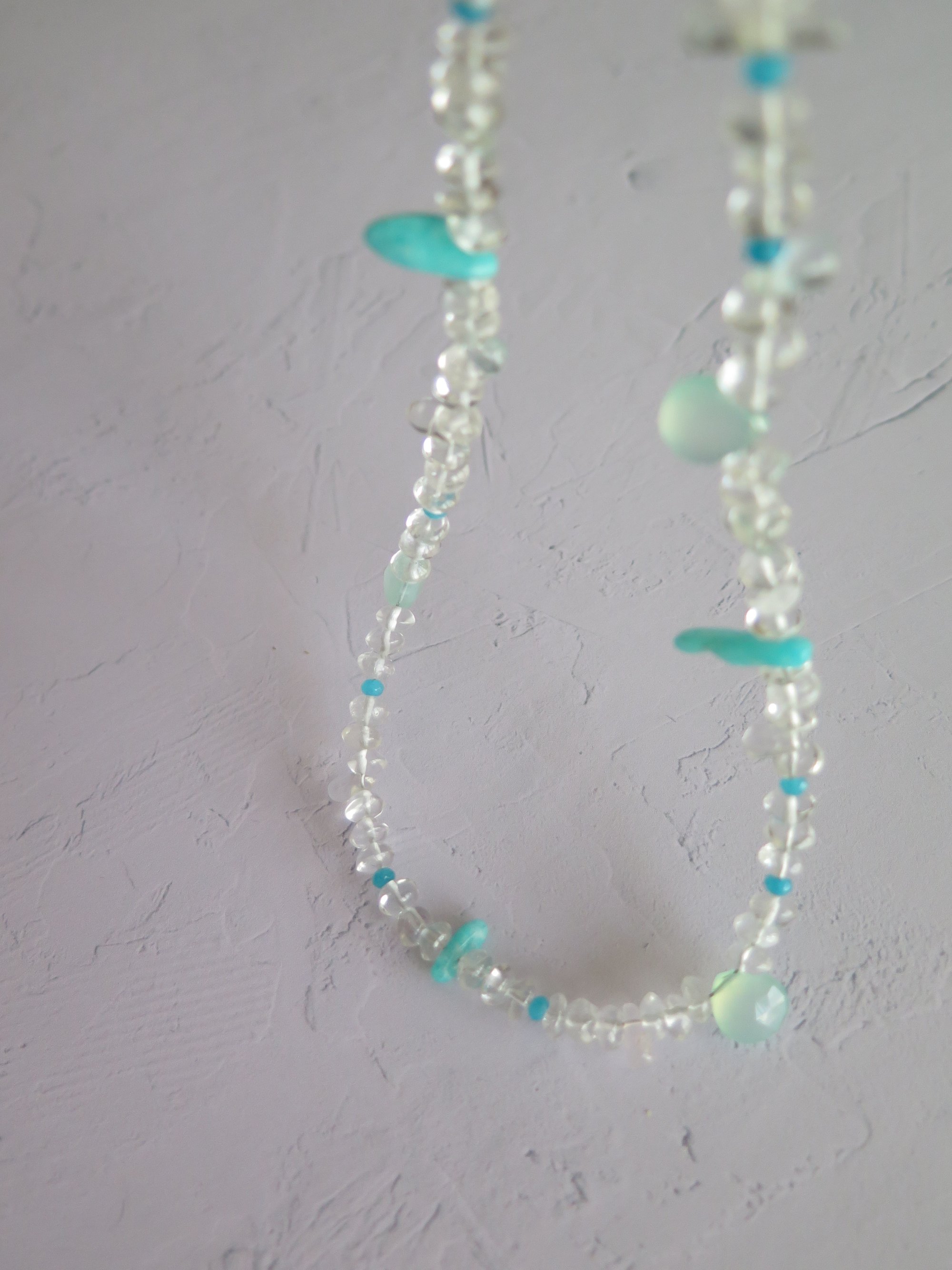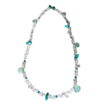 El collar Formentera es una pieza muy especial creada con aguamarina, calcedonia verde agua, berilo que nos lleva al Mediterráneo y sus azules pero también nos acerca al Atlántico con gran personalidad y fuerza, que son nuestras raíces.