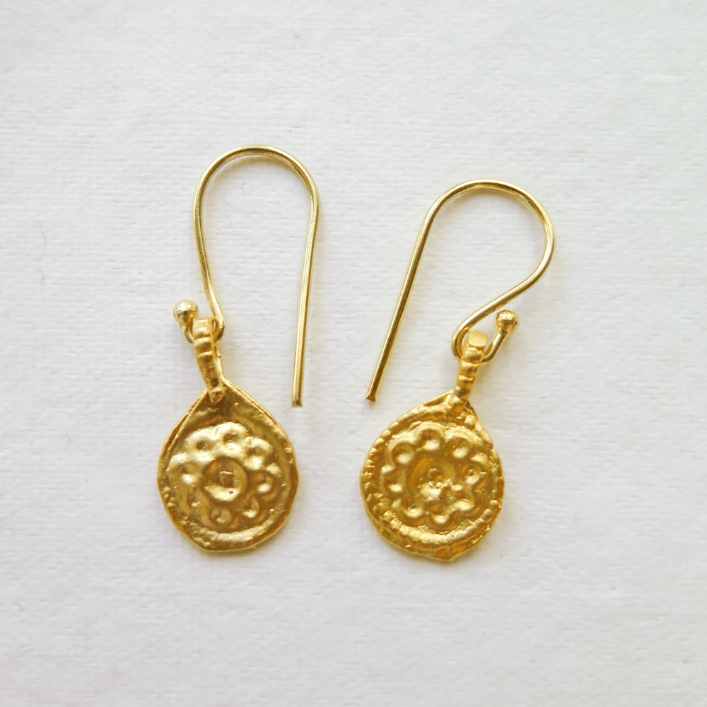 Pendientes cortos creados con una pieza artesanal dorada mate. El cierre es de colgar.